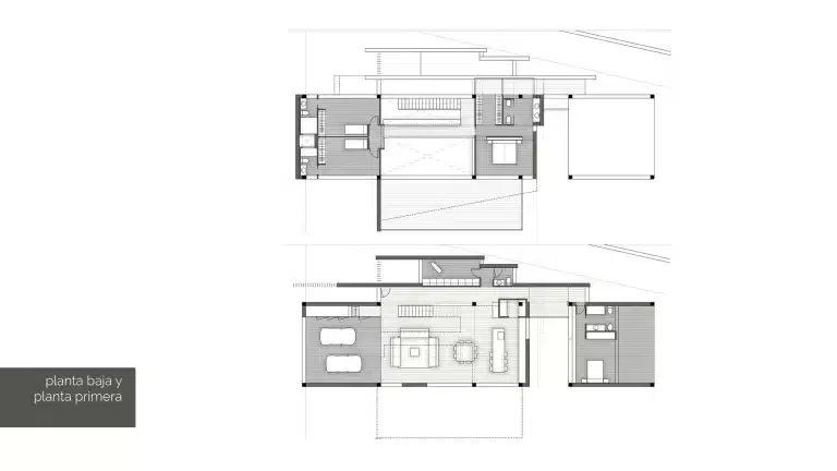 Se caracteriza principalmente por sus planos inclinados. La vivienda posee varios niveles. En planta baja se encuentra la zona de estar, con un amplio salón. Además, hay un dormitorio separado de esta zona mediante un distribuidor.