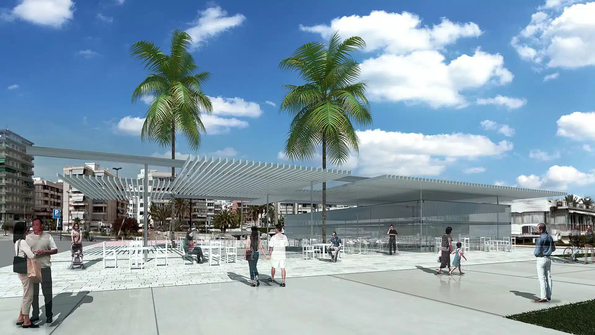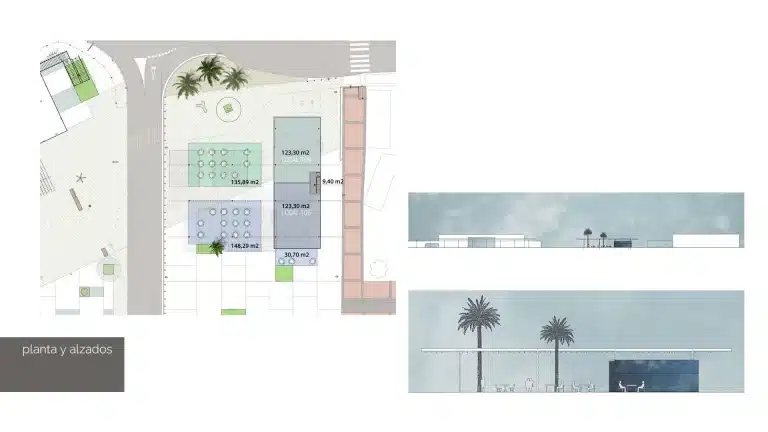 Su imagen cosmopolita y moderna se integra en el concepto de Oasis Mediterráneo. Se ideó una pérgola como elemento de unión entre la trama urbana y el puerto pesquero. Así, se generan recorridos y zonas de paso, vinculadas a los locales comerciales destinados al ocio, dando lugar a zonas de sombra. Cuenta con casi 300 metros de superficie construida, repartidos en dos locales. Además de otros 300 de terraza, que pasan a formar parte visualmente de los ya existentes.