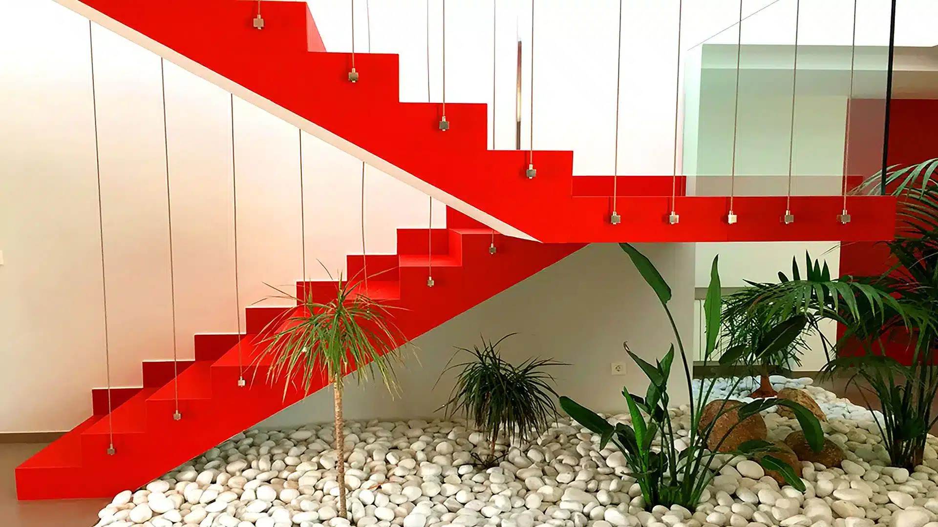 En el núcleo interior de la casa se encuentra la escalera flotante, también en color rojo y sin pasamanos, el cual crea un efecto visual de escalera suspendida en el espacio, sobre un jardín zen en el interior de la vivienda, que combina elementos naturales con la geometría y la composición.