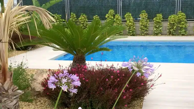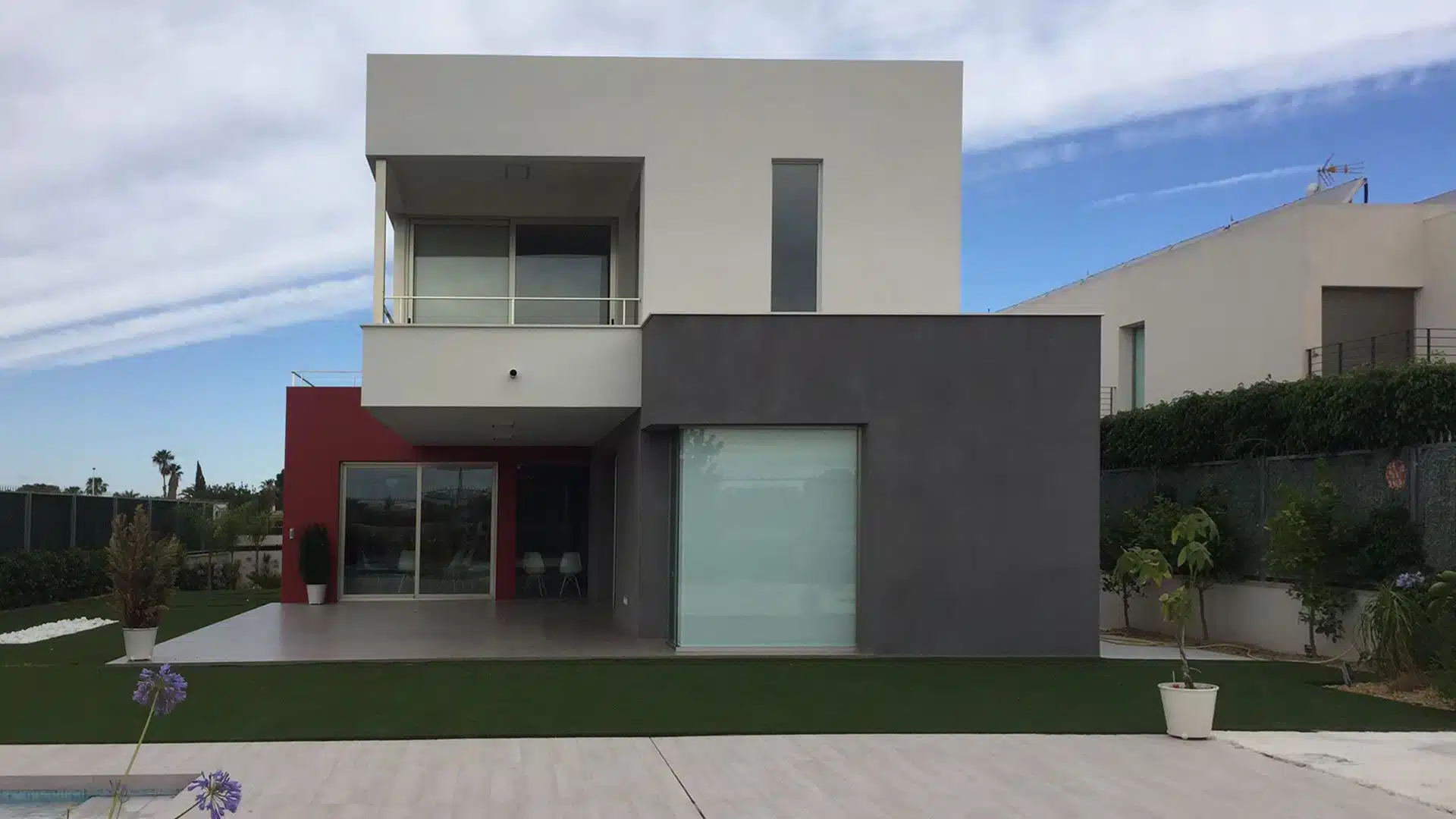 En este proyecto cobran vital importancia las circulaciones, la vivienda se organiza entorno a un eje principal pasante. Éste comunica el acceso desde la fachada principal, recorriendo el interior de la casa, hasta el jardín geométrico de la parte posterior organizado entorno a la zona de la piscina.