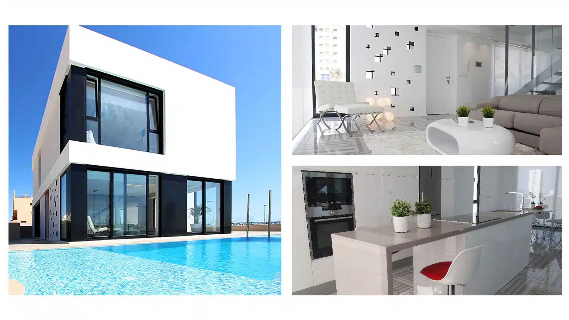 El interior de la vivienda es amplio, con colores claros predominantes, y mucha luz natural. Cuenta con tres dormitorios equipados con armarios empotrados, vestidor, tres cuartos de baño (uno de ellos en suite), cocina de diseño, garaje en la planta sótano con capacidad para tres coches, cuarto de lavandería, etc. Dentro de la parcela se encuentra la piscina privada desde la que se puede ver el mar tranquilamente.