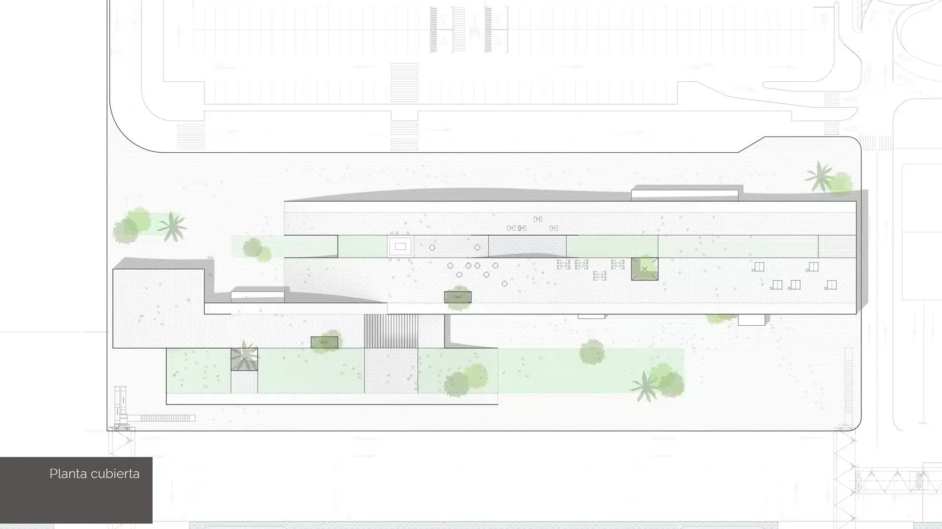 La cubierta se entiende como una extensión del exterior, como una continuación de las dos plazas. Una cubierta curva, que con pendientes transitables permite que el entorno de la terminal marítima invada el “techo” de la misma.
