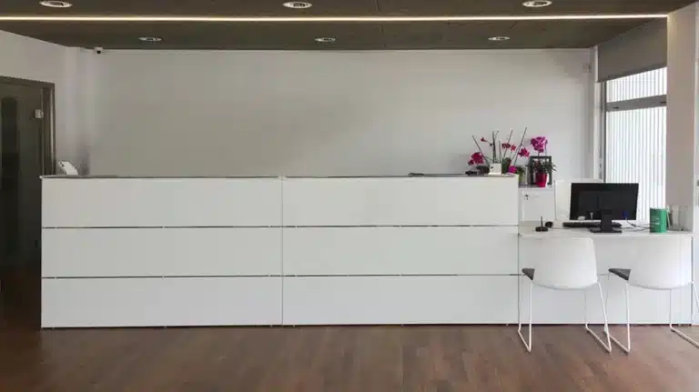 En Marina Port, Puerto de Mallorca, predominan los colores claros, todo se concibe en blancos, carpinterías gris claro y lamas de aluminio y formas rectas y puras. Por la noche la iluminación adquiere protagonismo enfatizando los volúmenes del edificio, poniendo en valor sus rasgos, su sencillez y rotundidad.