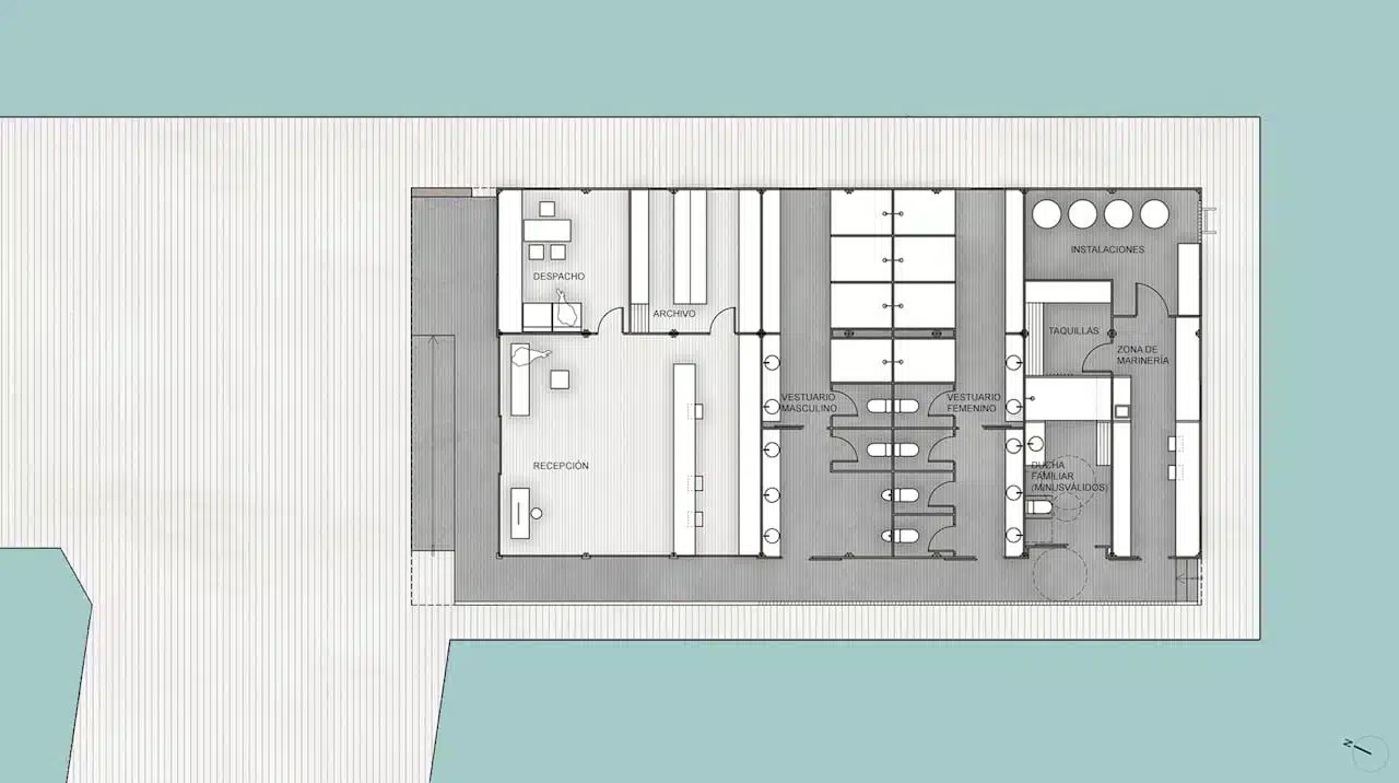 Se requería de una espacio en la entrada de este puerto deportivo, que sirviera como recepción del mismo. Además, debía tener una zona de despachos y archivo para uso interno. Así se diseñó el edificio proncipal.