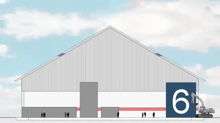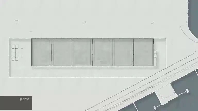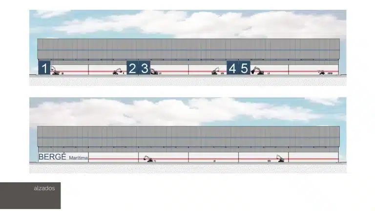 Esta nave industrial en el puerto de Cartagena es el resultado de un concurso público. Tiene una superficie de más de 11.000 metros cuadrados. Tiene una forma rectangular con una longitud de 220,46 metros y una anchura de 50 metros.