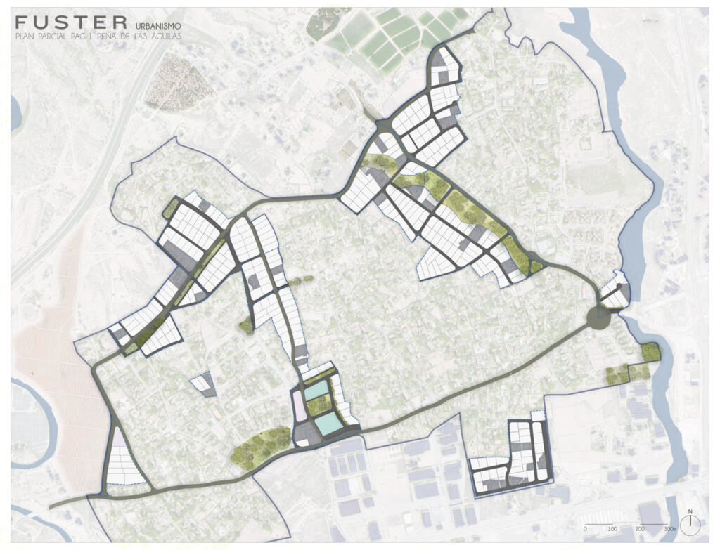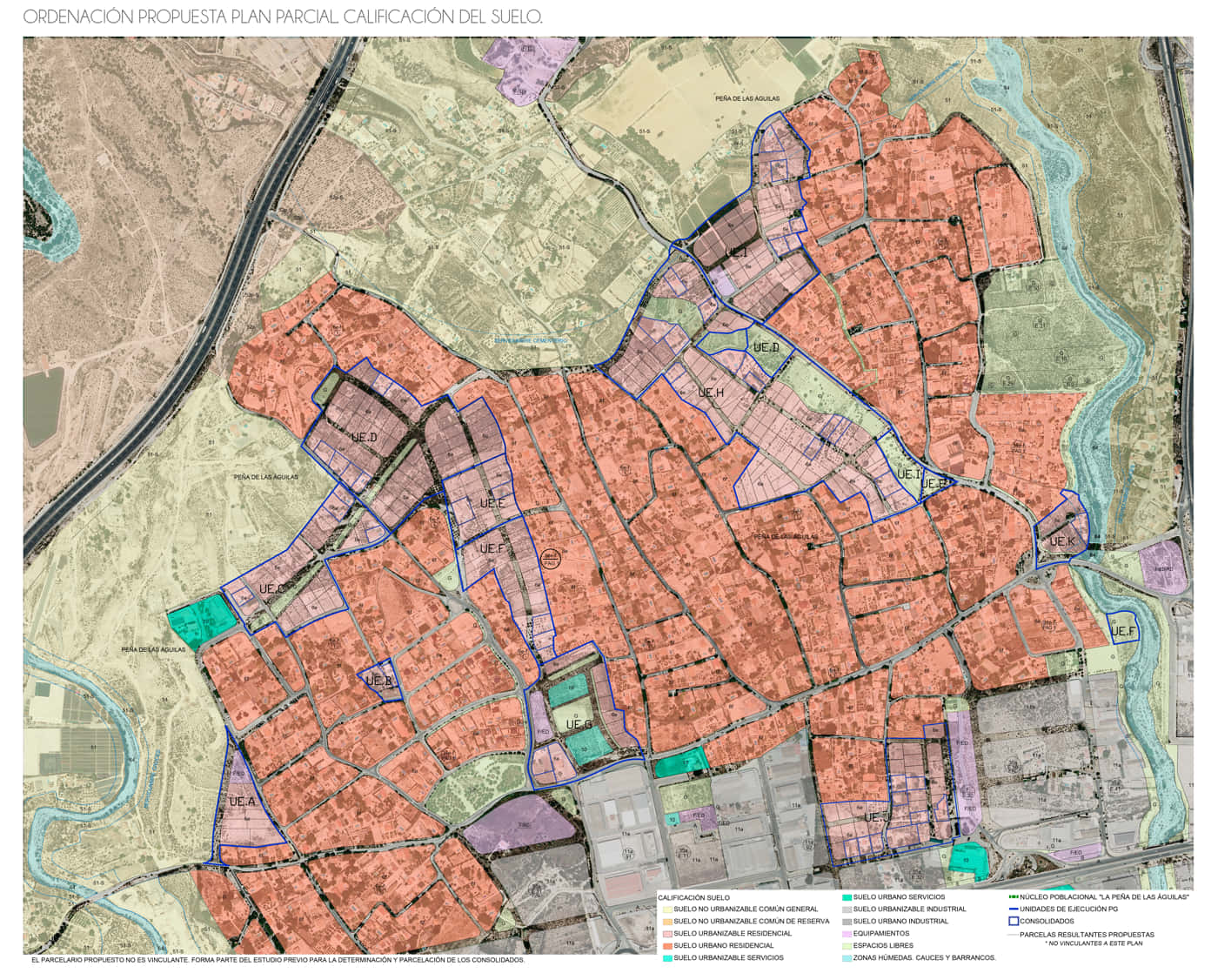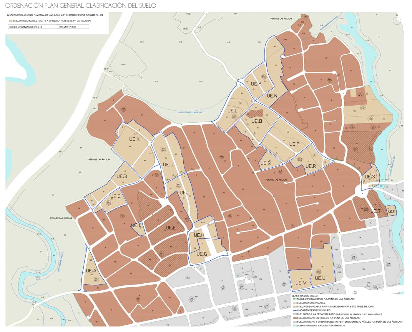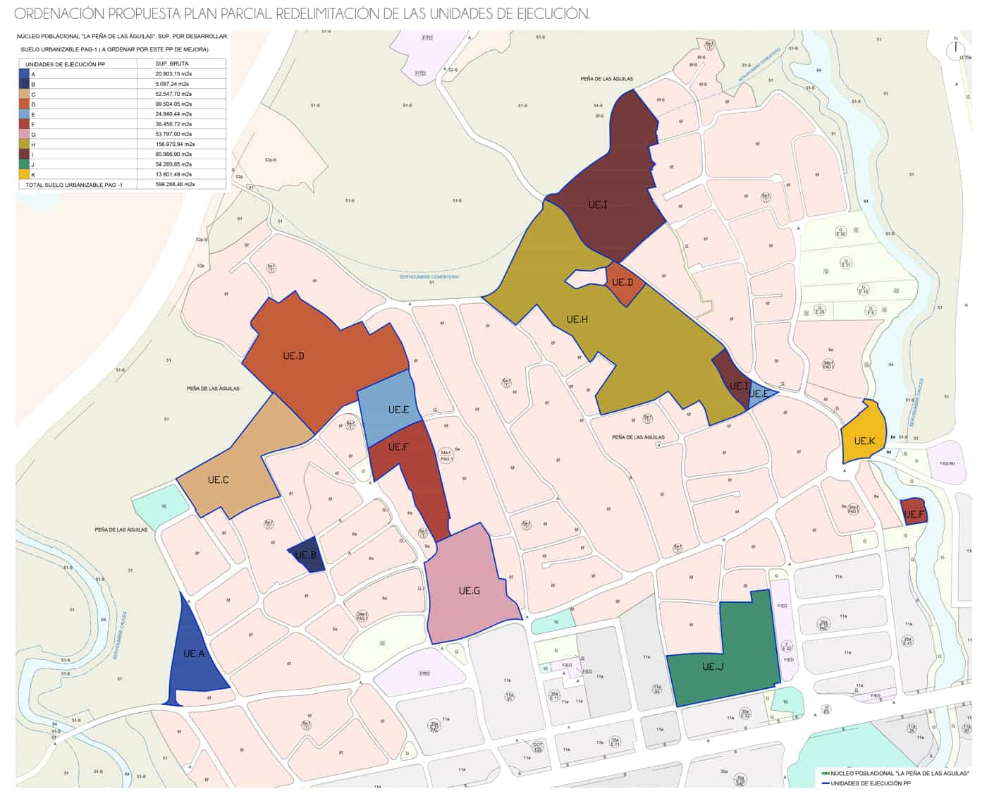 Además, se mejora la estructura viaria del núcleo, se reordena la unidad de ejecución K para adecuarla a las conexiones viarias ejecutadas de un modo diferente a la previsión de Plan General. Se aumenta el suelo destinado a equipamientos, y se mejora la zona destinada a clave 10 (servicios), reduciendo la edificabilidad terciaria a la mínima por norma y reordenándola de forma que se cree un núcleo terciario más urbano, más coherente con la trama residencial y que ofrezca a los habitantes de Peña de las Águilas un espacio de relación, a modo de centro urbano.