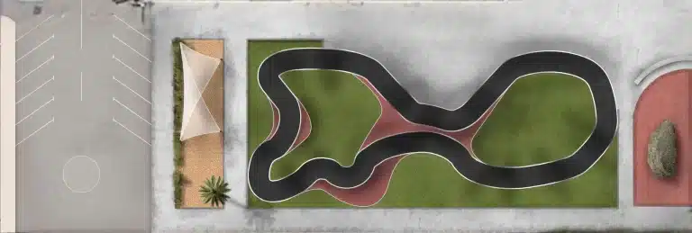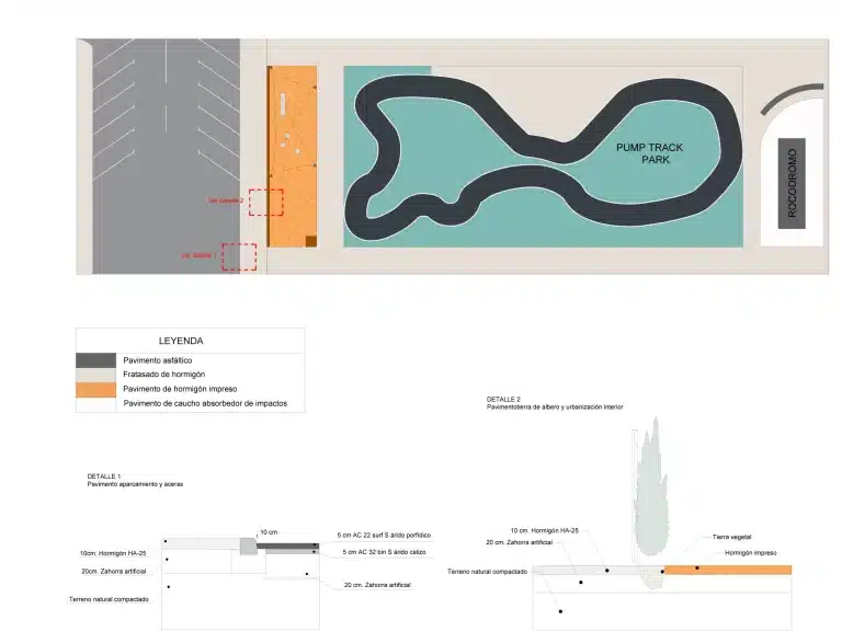Se ejecutará una pista Pump Track que tendrá una capa de rodadura en asfalto incluyendo taludes laterales, taludes pintados con slurry a color para dotar de mayor durabilidad la instalación, y césped artificial en todas las islas interiores.