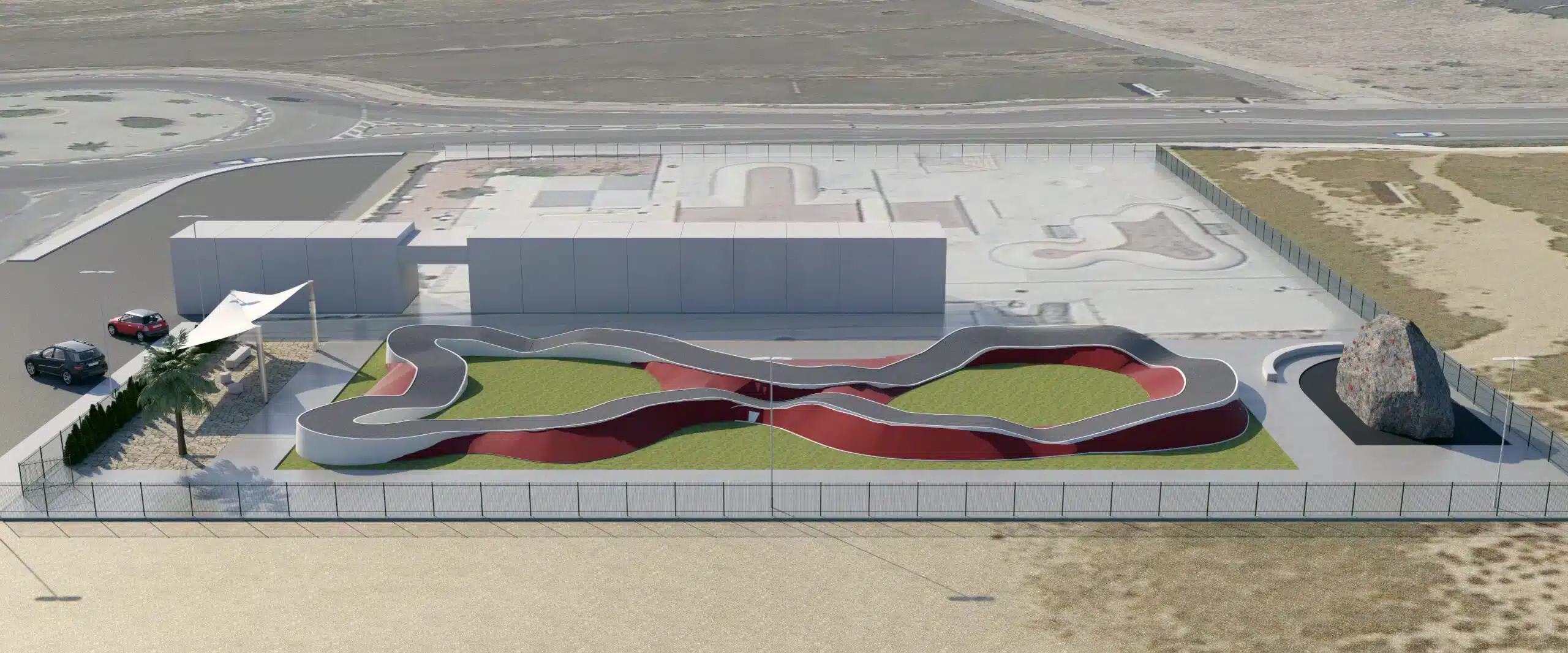 Esta urbanización de un PumpTrack y Rocódromo se lleva a cabo en una parcela deportiva municipal ubicada junto a la carretera CV-865 en Santa Pola (Alicante).