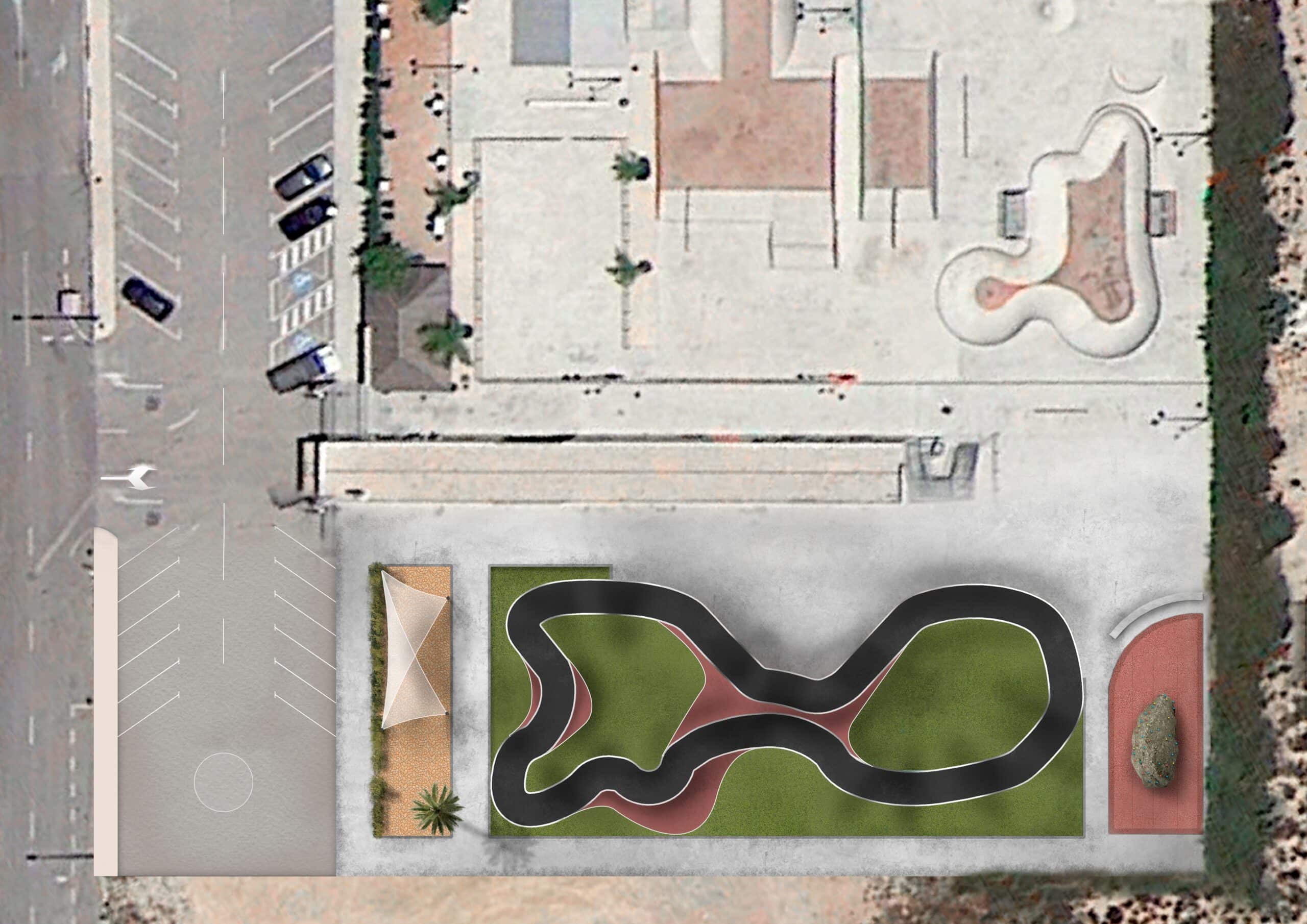Entre el aparcamiento y el Pump Track se proyecta una zona que contará con bancos y una pérgola realizada mediante velas tensadas que proporcione sombra.