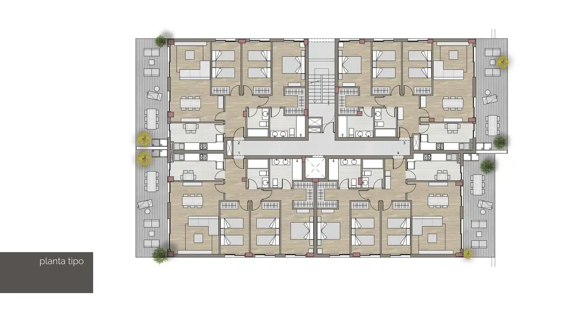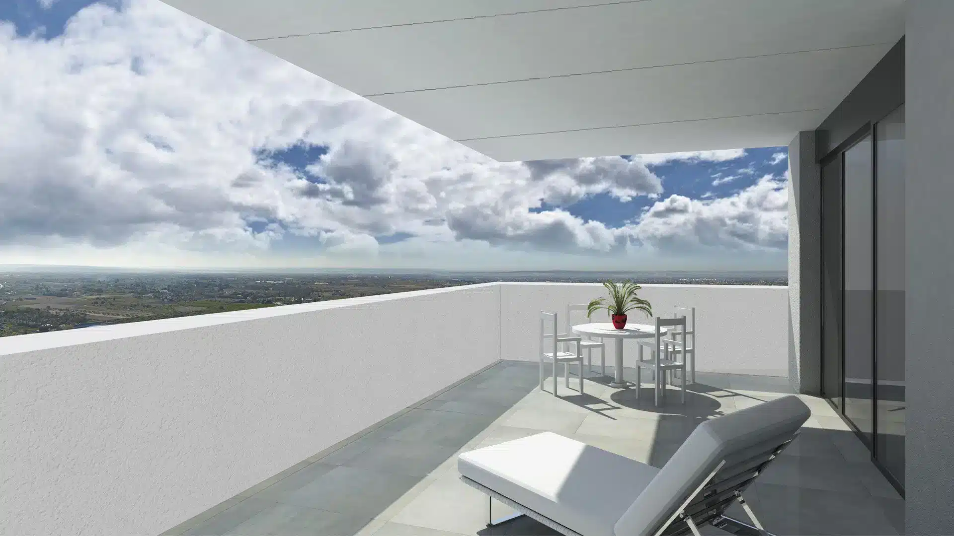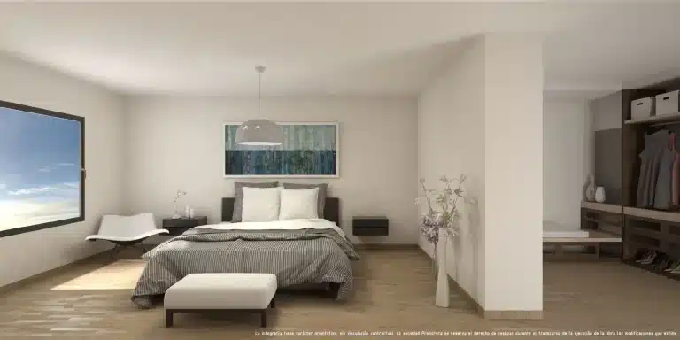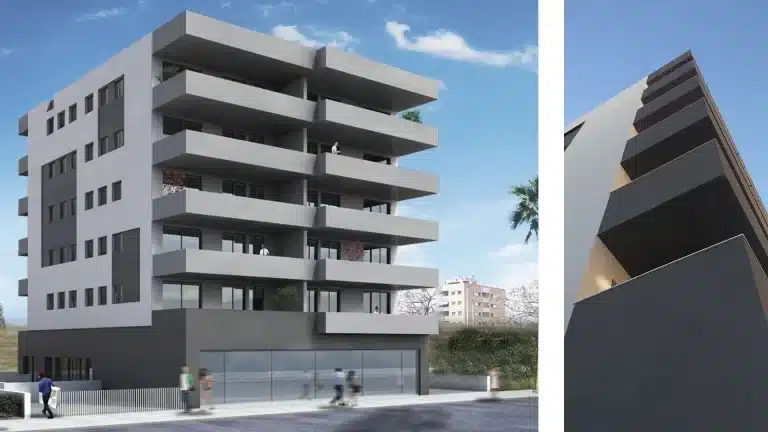 En la planta baja del edificio se sitúa una vivienda, que consta de 4 dormitorios, entre ellos un gran dormitorio principal con su propio vestidor y baño, aseo, cocina y salón-comedor, así como de una gran terraza. El resto de plantas del edificio estarán constituidas por cuatro viviendas de 4 tipos diferentes. Formadas por 1 dormitorio principal con un gran aseo y su propio vestidor, 2 dormitorios, salón-comedor y cocina. Las viviendas constan de una gran terraza-balcón, con vistas a los grandes huertos de palmeras d’Elx.
