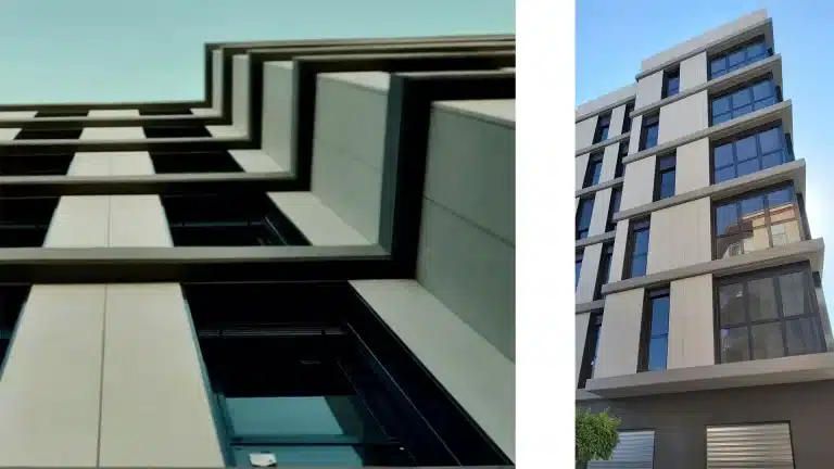 En fachada posee una combinación de huecos peculiar, de suelo a techo. Los materiales son suaves y en tonos grises. Un aplacado cerámico de gran formato le otorga verticalidad y esbeltez a la fachada.