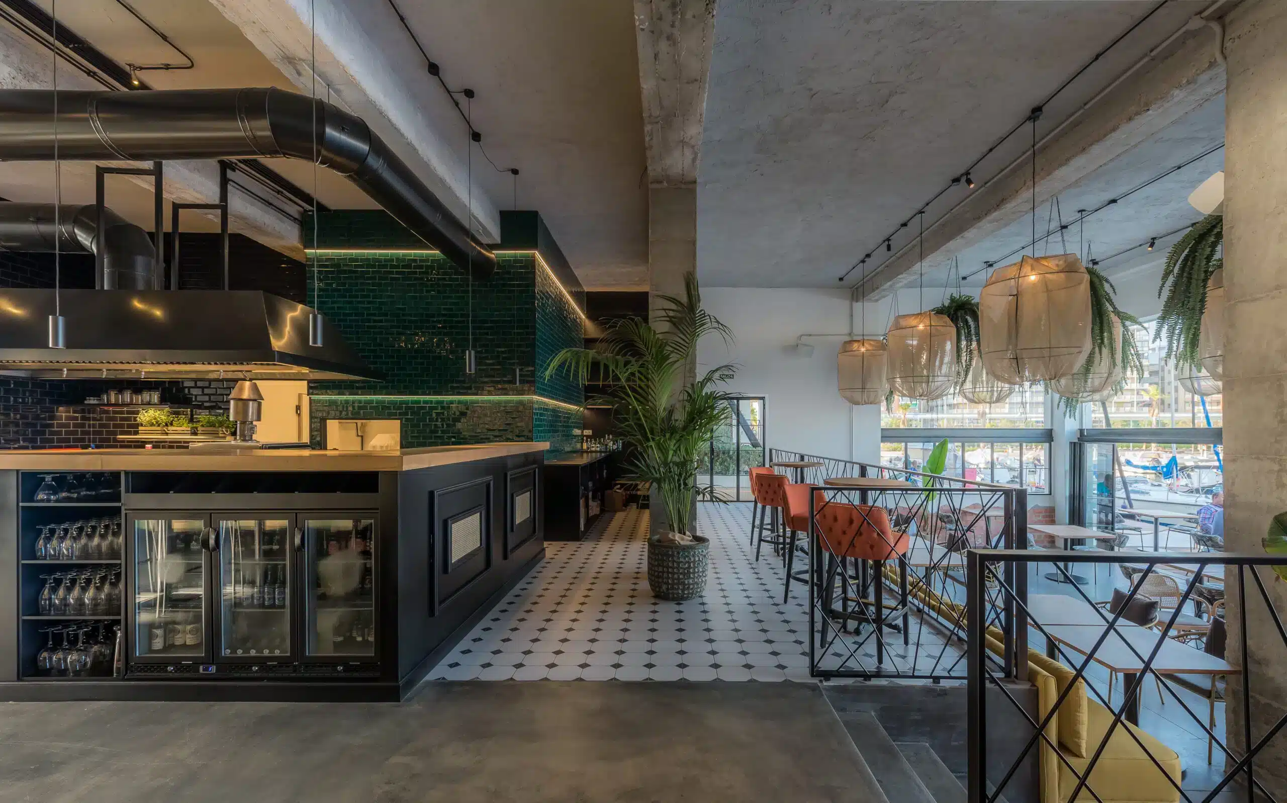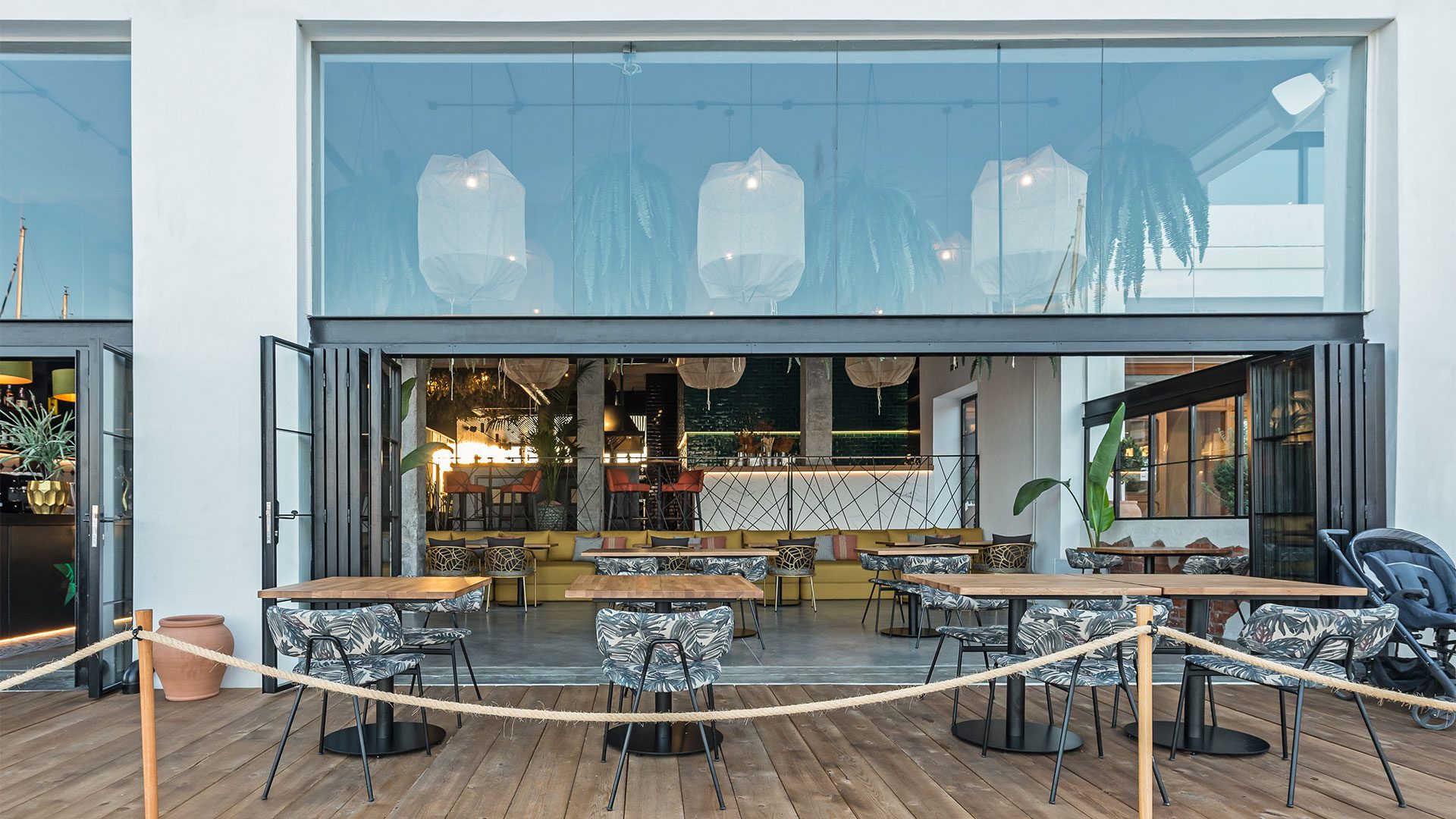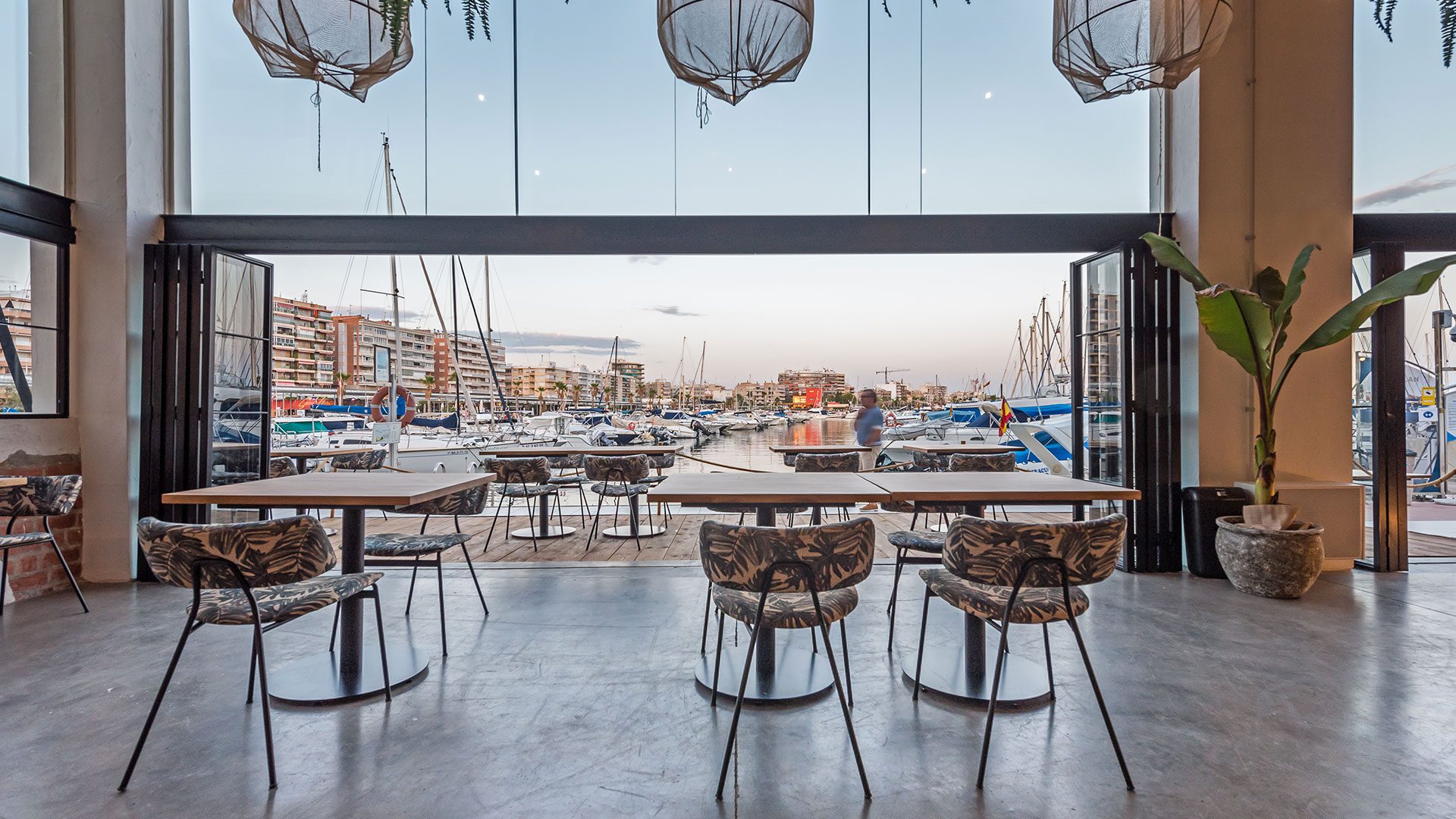 Debido a su localización, la fachada queda prácticamente abierta al mar. El local tiene unas vistas envidiables a las embarcaciones del Puerto de Santa Pola. Se crea una terraza de tarima de madera como límite entre el puerto y el interior del restaurante.