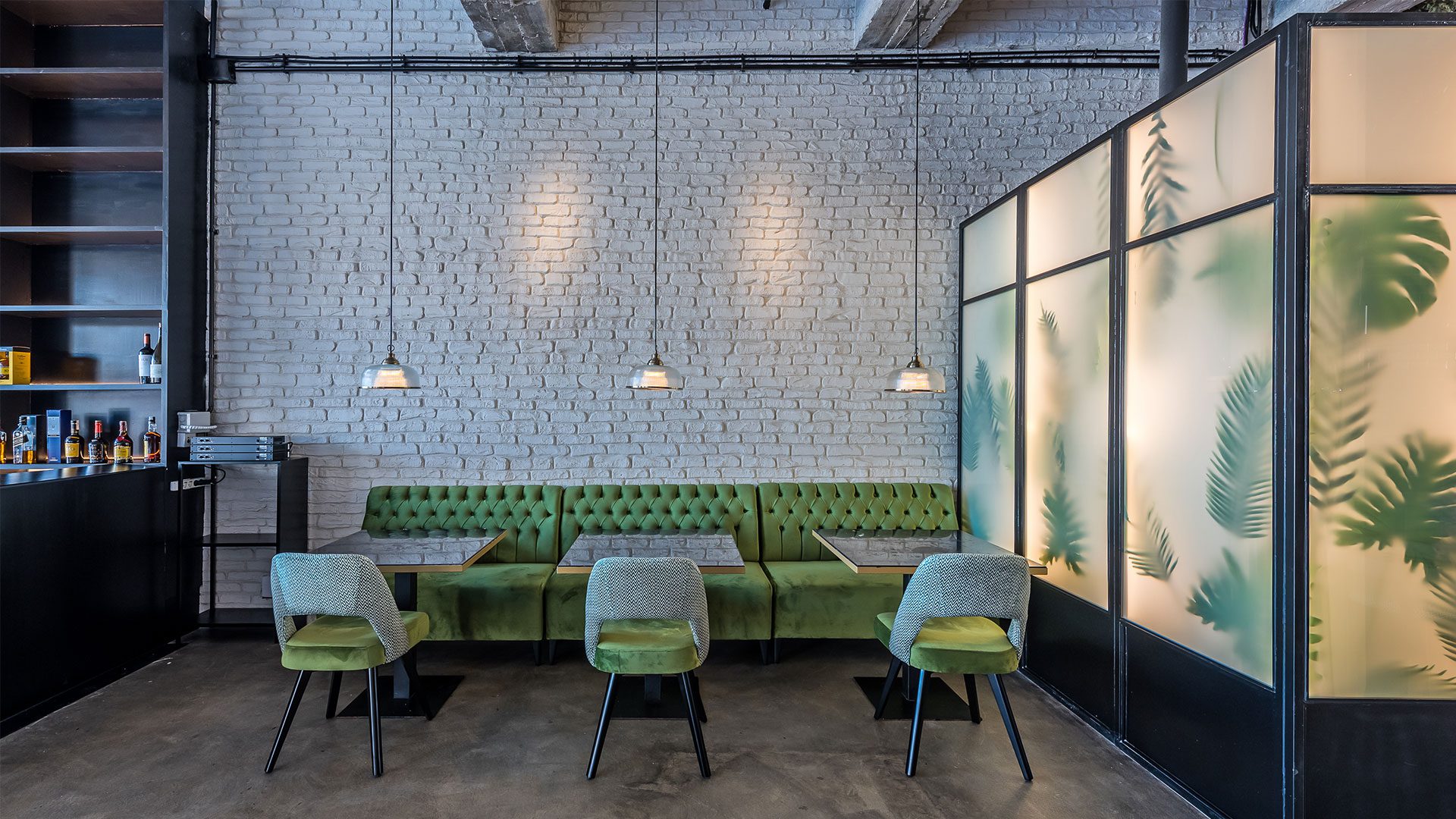 Una de las particularidades de este local es que tiene zonas en diferentes alturas. Éstas se ponen en valor mediante diferentes materiales y texturas. Se utilizan materiales básicos, muchas veces en bruto: hormigón visto en la estructura, hormigón pulido a modo de pavimento, o ladrillo caravista blanco. Se destacan zonas con azulejos con motivos geométricos y azulejo azul verdoso.
