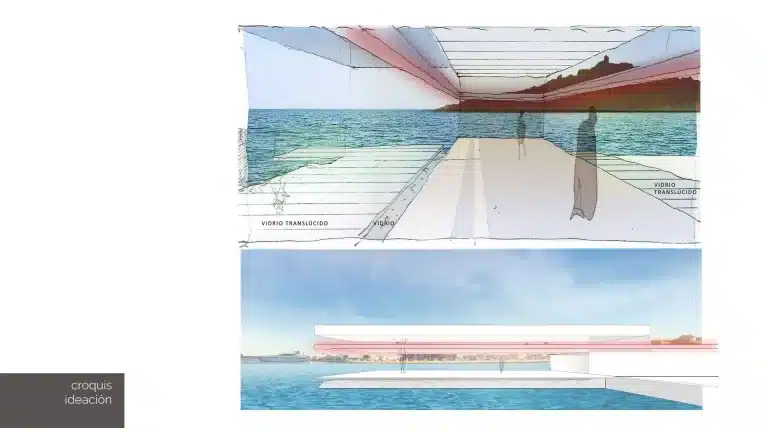 Posee dos plantas, una de ellas en semisótano, que se usa como almacenaje auxiliar para el restaurante. La terraza está en voladizo sobre el mar y la escollera existente.