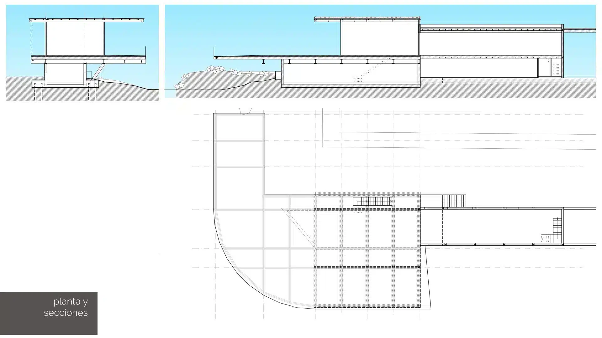 Posee dos plantas, una de ellas en semisótano, que se usa como almacenaje auxiliar para el restaurante. La terraza está en voladizo sobre el mar y la escollera existente.