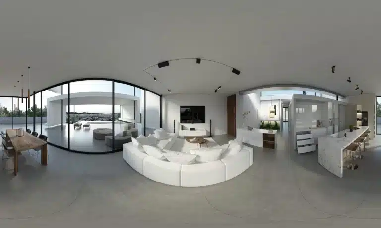 En la planta baja encontramos en la zona delantera de la vivienda el amplio salón-cocina-comedor con un gran ventanal que se abre hacia el porche y la piscina infinity, y en la parte interior de la vivienda encontramos los tres dormitorios y los dos baños. En la planta sótano encontramos un garaje, un almacén y un aseo.