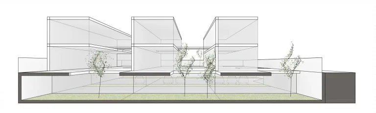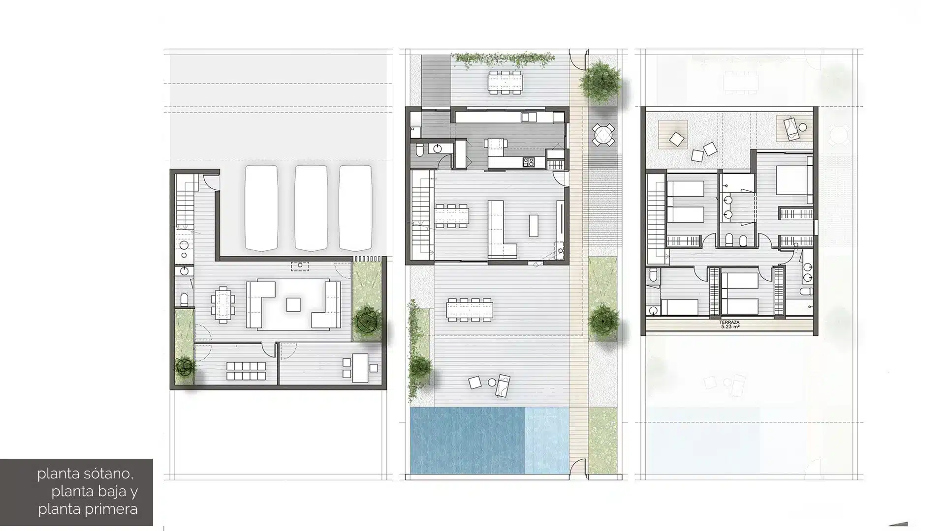 Las viviendas tienen sótano, planta baja y planta primera. En la planta baja se encuentra la zona de día y de estar, y en la planta primera la zona de dormitorios. En el sótano encontramos usos como despacho o estar. Destacan en el sótano los patios ingleses, que dejan pasar la luz natural. Además, en el sótano de cada vivienda está el acceso al parking compartido, donde caben dos o tres coches por vivienda.